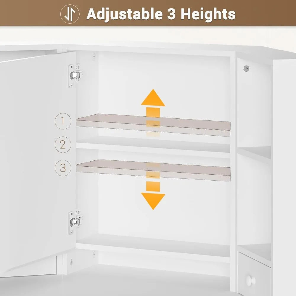 【Ample Storage Space】The corner vanity has 5 open shelves, 4 drawers, 2 hidden shelves behind the mirror, and rotating shelves on the bottom right to hold all your cosmetics, styling tools, and other beauty essentials. Keep all your items neat and organized.