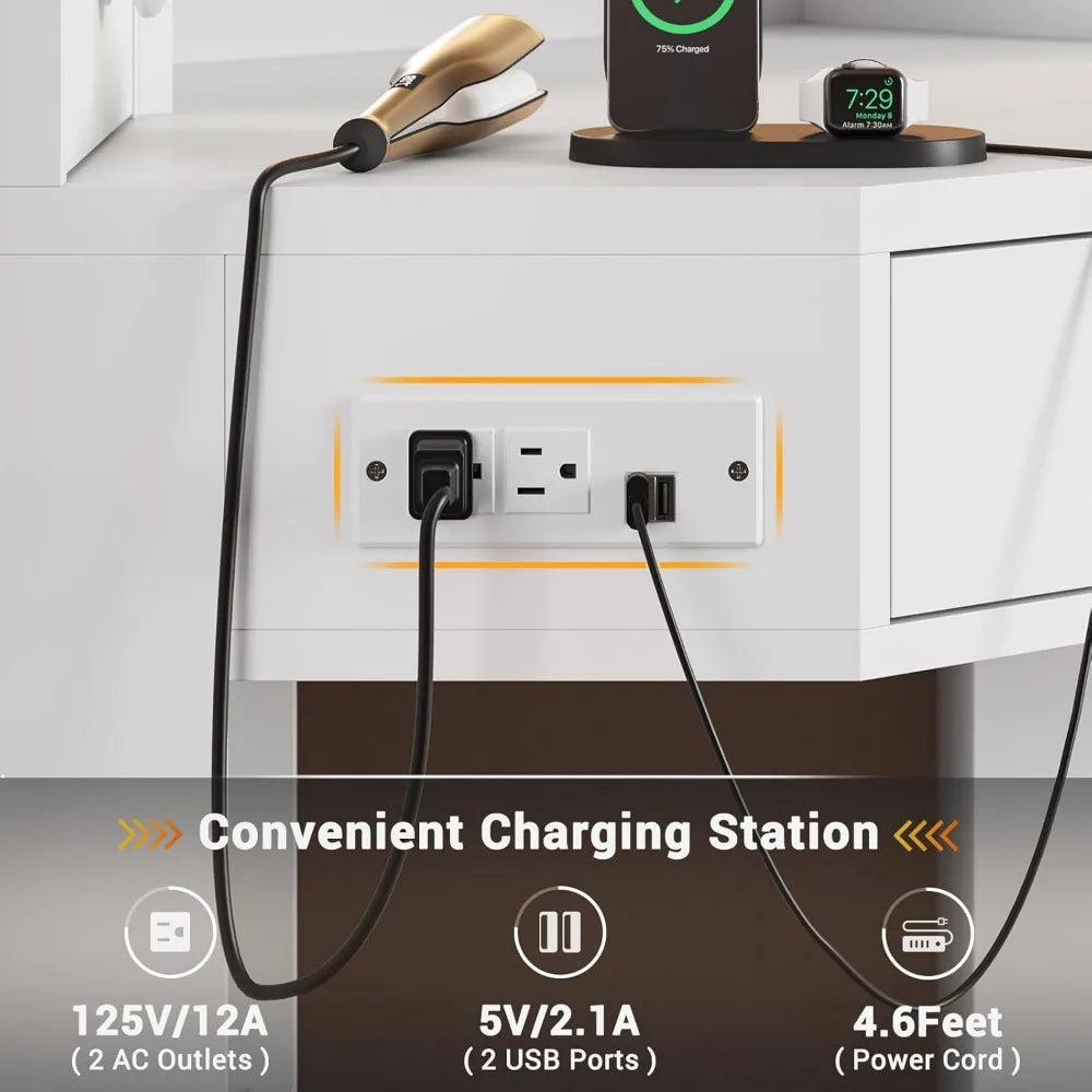 【Built-in Power Strip】This vanity desk is equipped with a charging station, including 2 USB ports and 2 standard outlets, which can more conveniently connect a hair dryer, beauty instrument, and charge your mobile phone, tablet or other electronic devices at the same time. No more worries about charging!