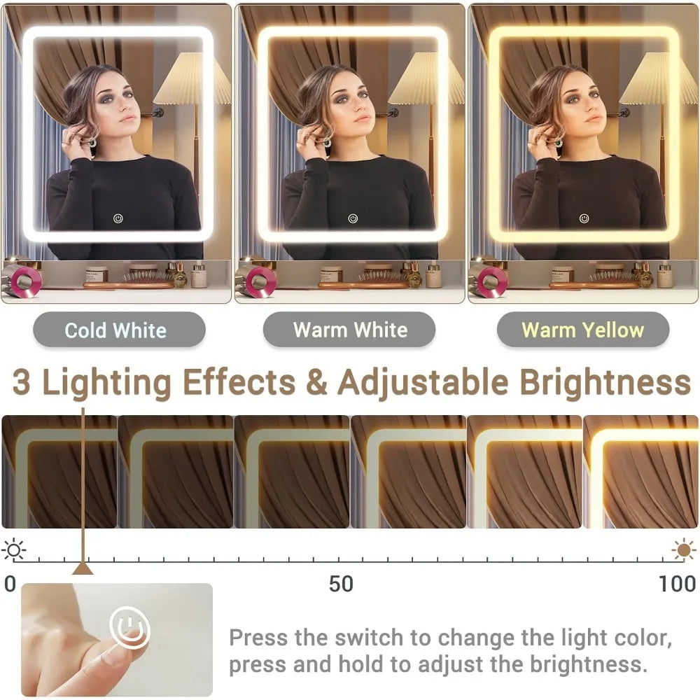 【3 Colors of LED Lights】The mirror of makeup vanity has built-in LED light strip and a touch screen switch, which is more durable and safer than light bulbs. Three light colors can be set: cool white (for formal makeup), warm white (for skincare or daily makeup), and warm yellow (for dinner or party makeup), which simulates the lighting of different scenes and reduces makeup color differences. The light brightness of each color can be adjusted.